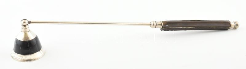 Leírás: Hosszú szárú fém koppintó, fém berakásos fa fogóval, kopással, h: 34 cm