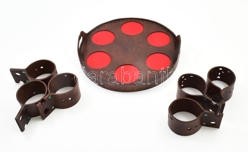 Leírás: Iparművész retro bőr asztali kínáló tálca, 6 db réz veretes üveg tartóval, kopásnyomokkal, d: 34 cm