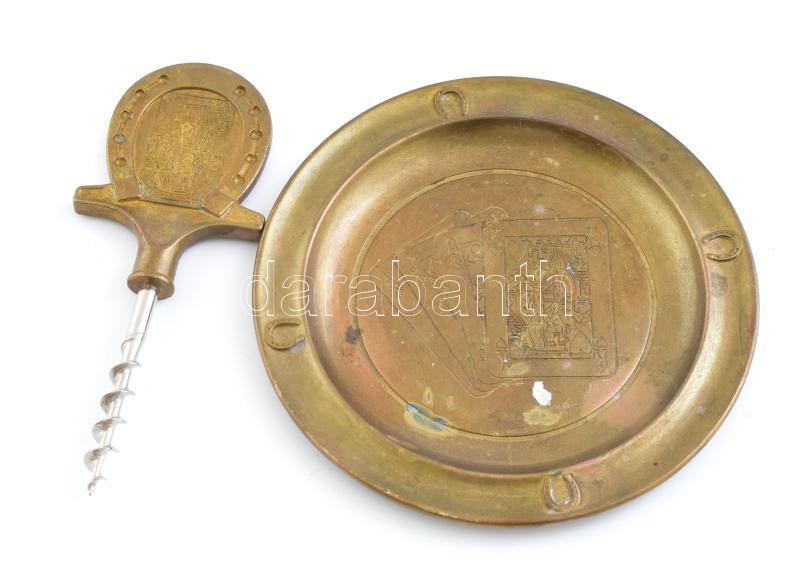 Leírás: Kártyamintás bronz kártyatartó és dugóhúzó, jelzés nélkül, szép állapotban, d: 14 cm, h: 14 cm