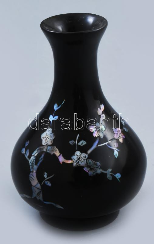 Leírás: Lakkosozott fa váza gyöngyház berakással 12 cm