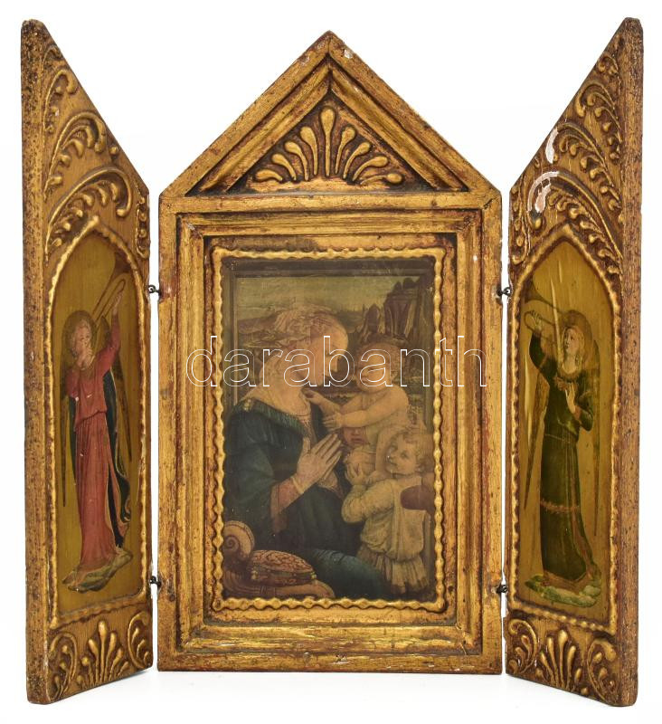 Leírás: Modern triptichon nyomattal. Fa. Sérült díszítéssel 23x24 cm