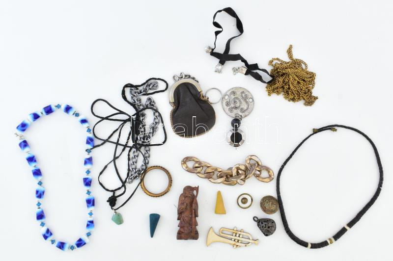 Leírás: Vegyes bolha tétel: nyakláncok, kis erszény, faragott keleti szobrocska, gombok