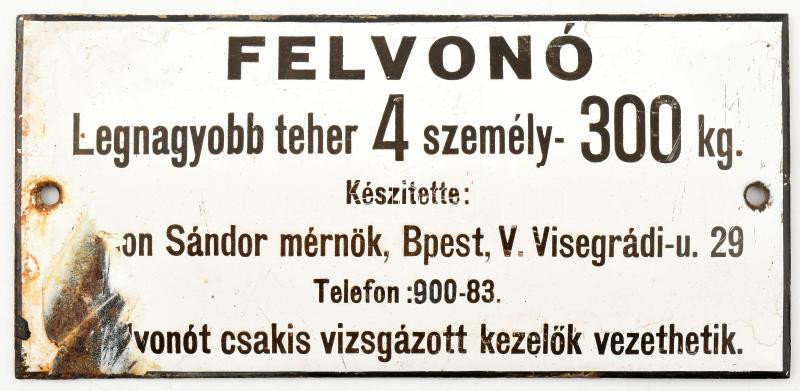 Leírás: cca 1930 Felvonó zománcozott fém táblája, sérüléssel, 18x8,5 cm