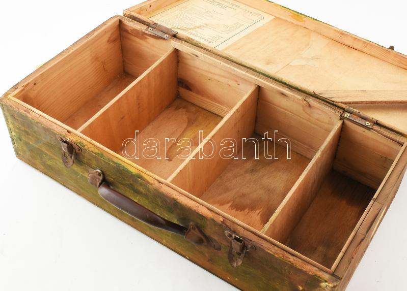Leírás: cca 1950 Légoltalmi mentőláda. Fa, belül papír címkével, csattal 24x47 cm