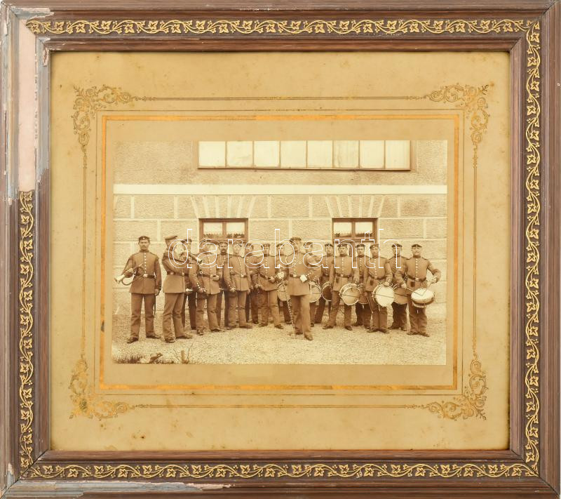 Leírás: cca 1900 Német katonazenekar fotó, kartonon 24x18 cm / Üvegezett keretben 38x34 cm