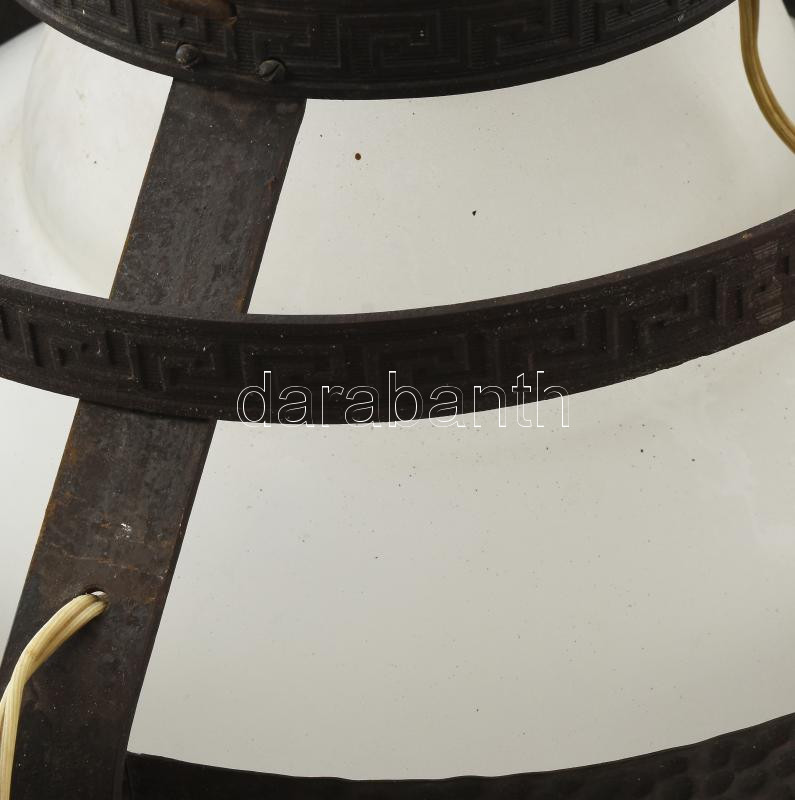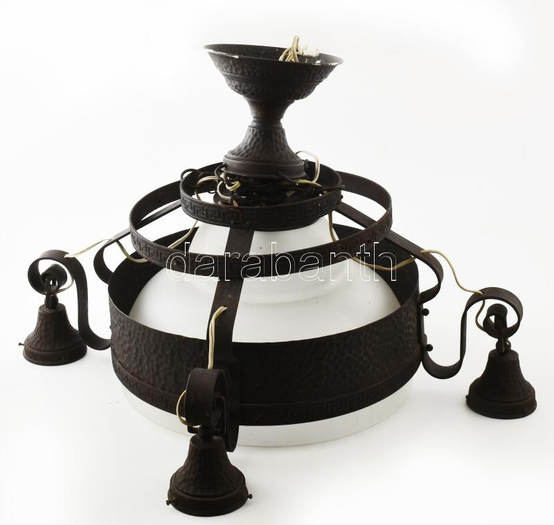 Leírás: Antik kovácsolt vas csillár, középső nagy búrával, mely savmaratott, kopással, d: 70 cm