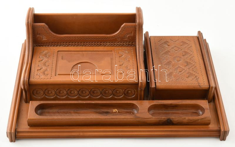 Faragott fa asztali írószertartó, jó állapotban, 40x26x12 cm https://www.darabanth.com/hu/451-Gyorsarveres/451.0/Mutargy-papirregiseg-egyeb/Mutargyak-antikvitas~500009/Faragott-fa-asztali-iroszertarto-jo-allapotban-40x26x12-cm~II3000099