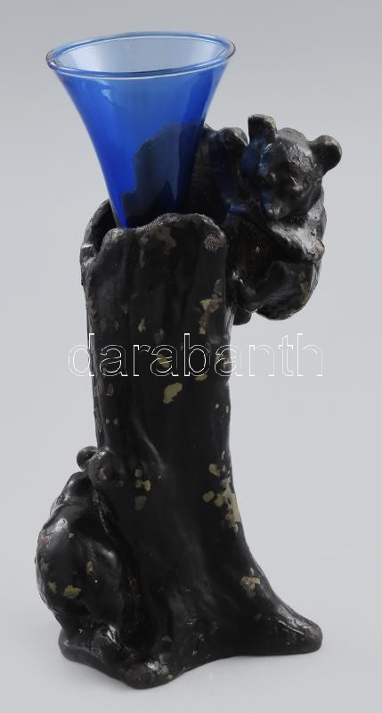 Leírás: Fatörzsön játszó medvebocsok. Antik öntött vas váza medve figurális díszítéssel, királykék színű üvegbetéttel. Jelzéssel, kopással, m: 20 cm