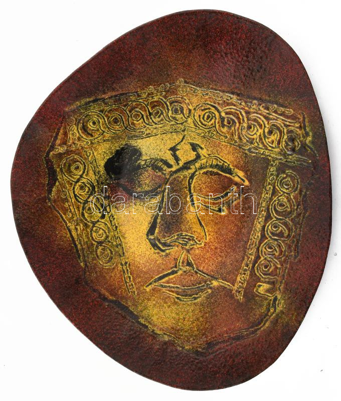 Leírás: Halotti maszkot mintázó fali dísztál, zománcozott fém, jelzés nélkül, hibátlan, 32x27 cm