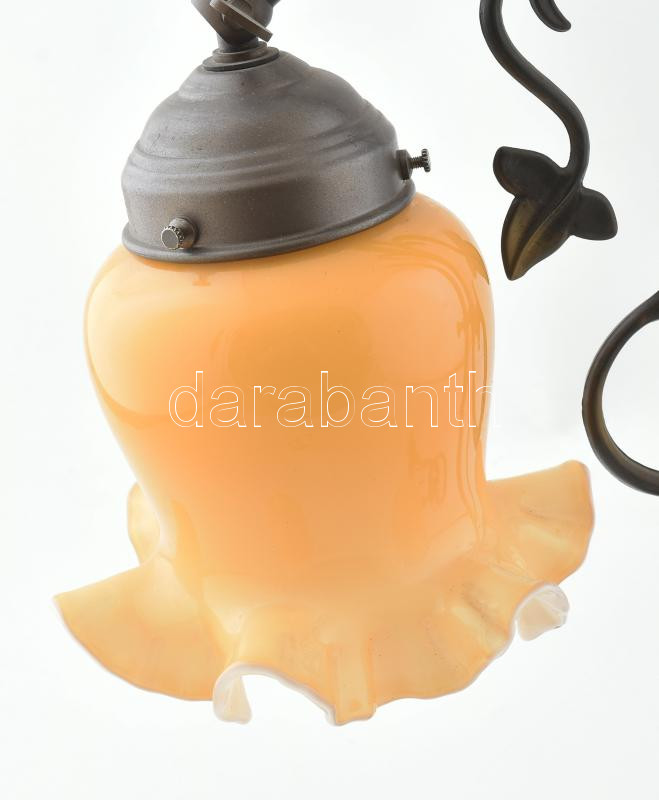 Leírás: Régi asztali lámpa, bronzírozott fém, kétrétegű fodros üvegbúrával. Állítható magasságú, működik, m: 49,5 cm