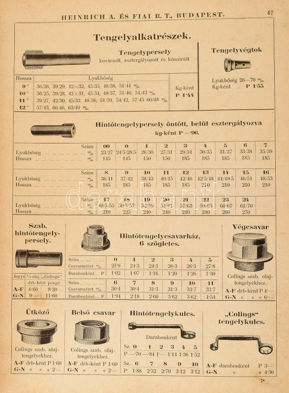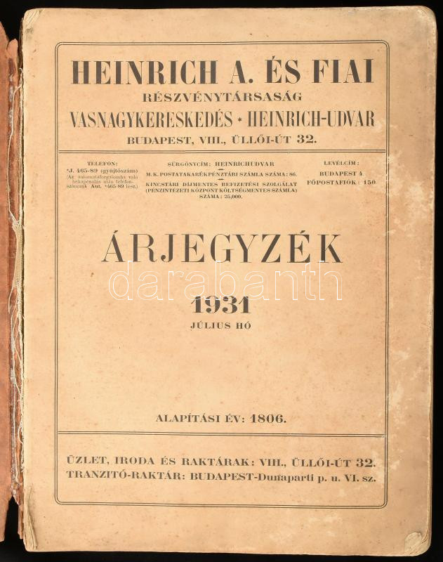 1931 Heinrich A. és Fiai vas-nagykereskedők árjegyzéke. 1931. júl. Gazdag képanyaggal illusztrált. Bp., Franklin-ny., 372 p., kihajtható mellékletekkel. Papírkötésben, kissé foltos borítóval, szakadt gerinccel.