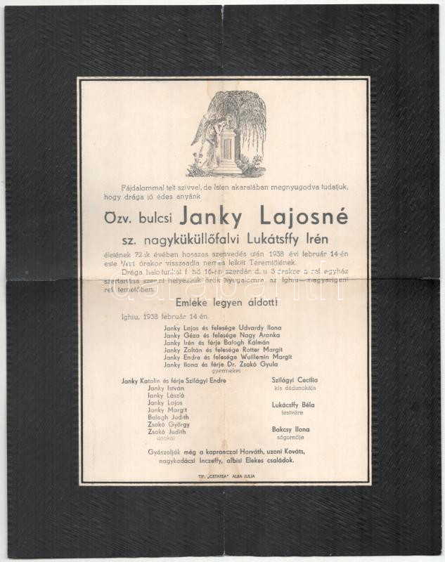 1938 Ighiu (Magyarigen), halotti értesítő, hajtott https://www.darabanth.com/hu/451-Gyorsarveres/451.0/Mutargy-papirregiseg-egyeb/Nyomtatvanyok~1000005/1938-Ighiu-Magyarigen-halotti-ertesito-hajtott~II3001513