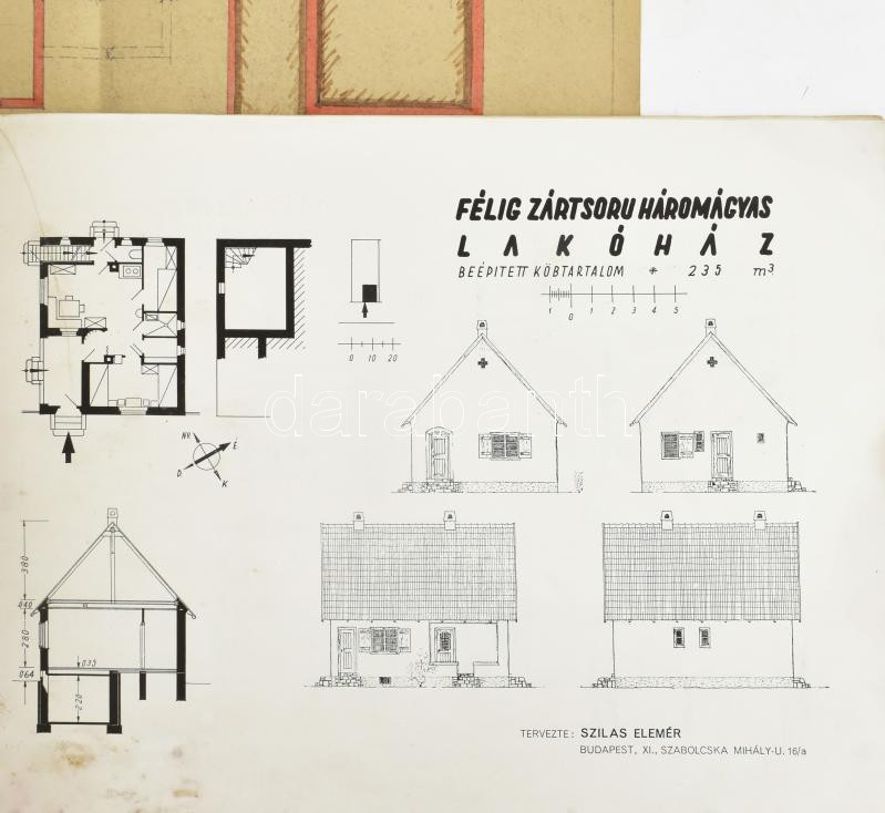 1941 Kis családi házak. A M. Kir. Iparügyi Miniszter úr támogatásával kiadja az Országos Lakásépítési Hitelszövetkezet. Dr. Kresz Károly előszavával. Írta és sajtó alá rendezte: Dr. Kotsis Iván. Tervrajzokkal illusztrálva. Tűzött papírkötés, viseltes állapotban, erősen sérült borítóval, néhány sérült lappal, helyenként foltos. + III. ker., Testvérhegyi telken épülő családi ház tervrajza, tervezte: Strebek Nándor építőmester, 1 : 100, pecséttel jelzett, hajtva, kis lapszéli szakadással, 42x36 cm