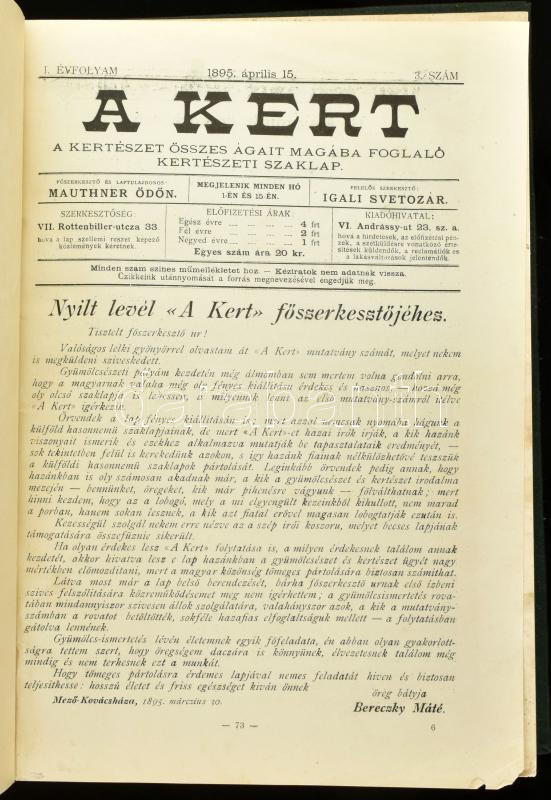 A kert. A kertészet összes ágait magába foglaló kertészeti szaklap. Főszerk és tulajdonos: Mauthner Ödön. I.-II. Évfolyam . Bp., 1896-97 Szórványszámok. Fekete-fehér és színes műmellékletekkel és fametszetekkel. vászon kötésben egybekötve,