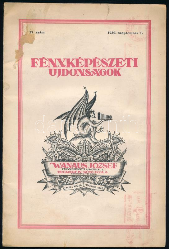 cc 1928-1940 fényképészeti és filmberendezési nyomtatvány, össz. 3 db: 1928. január 1., Fényképészeti Szemle, XVII. évf. 9. sz., hajtásnyomokkal + Fényképészeti Ujdonságok, 17 sz., 1930. szeptember 1., kissé sérült és kissé foltos + Palatinus filmterjesztő vállalat ismertetője a "Terta Hangos 16 mm-es" éghetetlen, hangos-keskeny filmleadó berendezésről és a filmellátásról