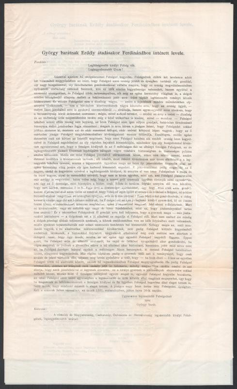 cca 1895 György barátnak Erdély átadásakor Ferdinándhoz intézett level...