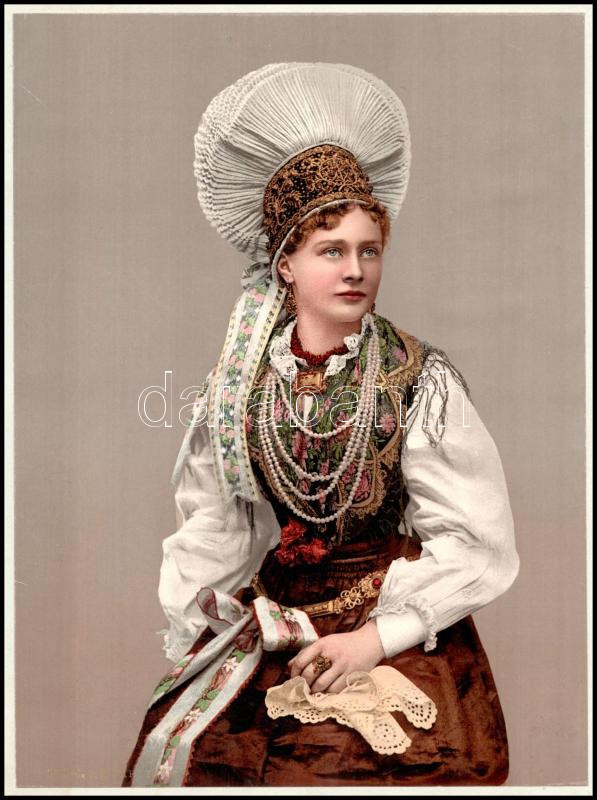 Leírás: cca 1900 Krainerin (szlovén népviseletes lány), nagyméretű, színezett fotokróm nyomat, dekoratív kartonon, 22,5x16,5 cm (teljes méret: 36x30 cm) / Slovenian folklore (girl from Kranjska), large-size, vintage photochrom print, on decoratve cardboard