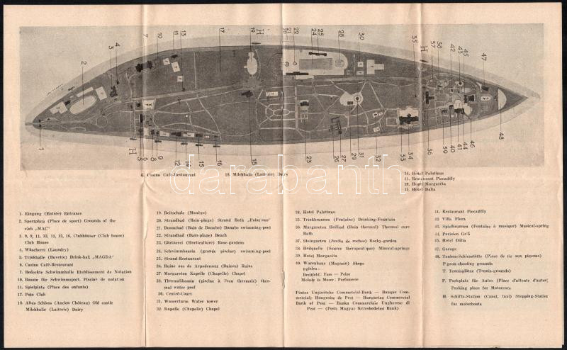 cca 1930-1940 A Margit-szigetet bemutató, többnyelvű idegenforgalmi prospektus, fekete-fehér képekkel (benne a sziget térképe, Hotel Palatinus, zenélő kút, stb.) Bp., Klein J.-ny., 4 sztl. lev. Tűzött papírkötés, hajtott, egy lapon szakadással.