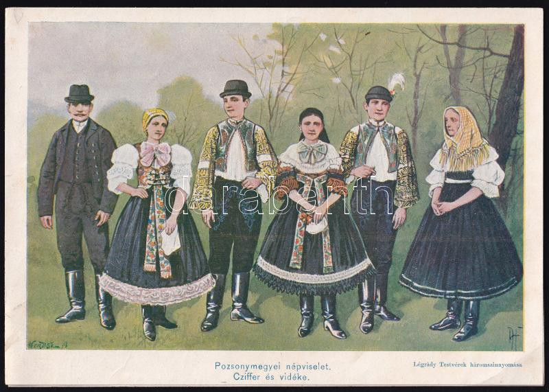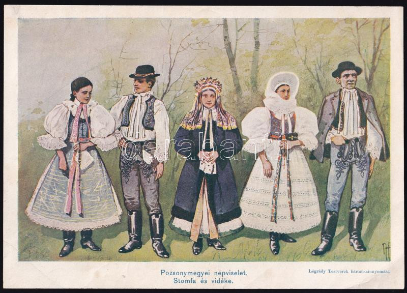 cca 1930 Felvidéki népviselet Pozsony megyéből, Cziffer, Stomfa vidéké... https://www.darabanth.com/hu/451-Gyorsarveres/451.0/Mutargy-papirregiseg-egyeb/Nyomtatvanyok~1000005/cca-1930-Felvideki-nepviselet-Pozsony-megyebol-Cziffer-Stomfa-videkerol-Legrady-Testver~II2945748