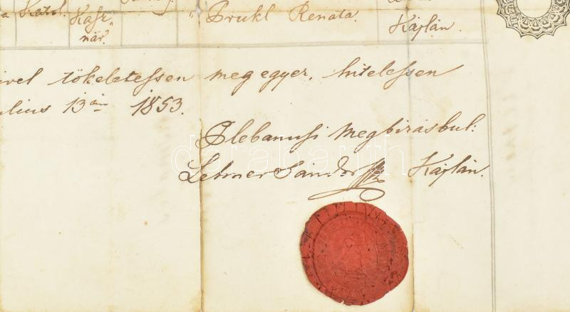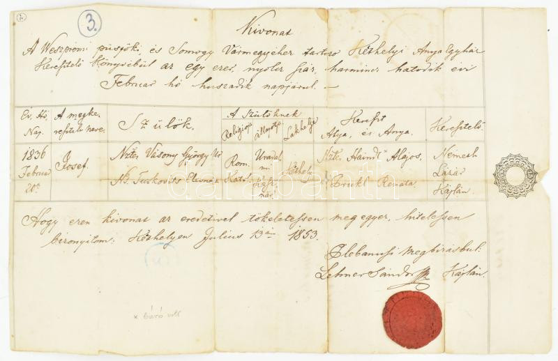 Leírás: 1853 Kéthely, anyakönyvi kivonat, Lehner Sándor (1823-1887) káplán aláírásával, viaszpecséttel, kissé foltos, hajtásnyomokkal, szakadásokkal, 34x21 cm