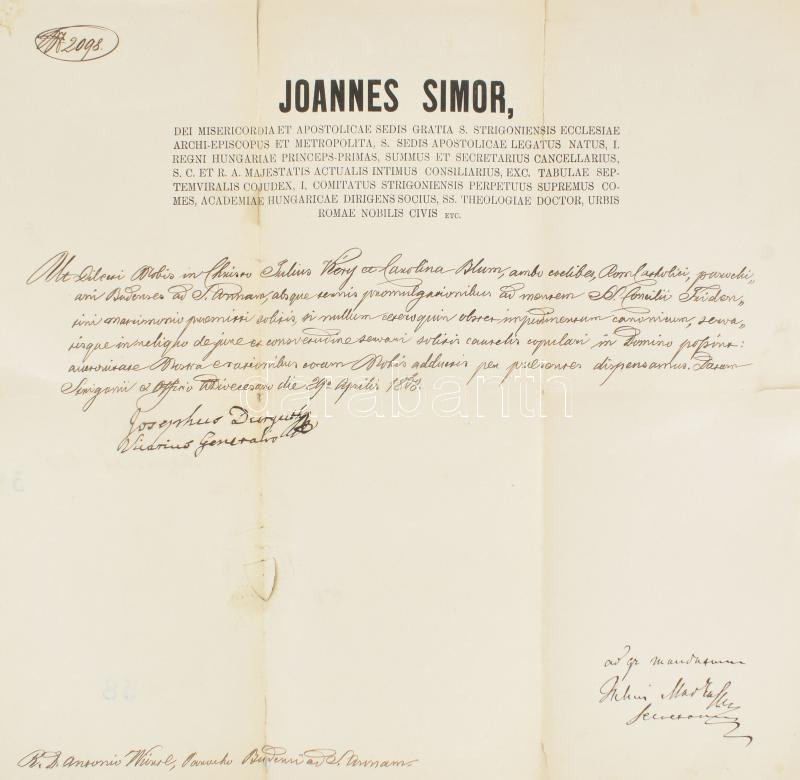 1868 Simor János (1812-1891) hercegprímás, bíboros, esztergomi érsek nevében kiállított, latin nyelvű engedély irat Kéry Gyula és Blum Karolina házassági ügyében, Durguth József (1790-1872) esztergomi kanonok autográf aláírásával, szárazpecséttel, 34x21 cm