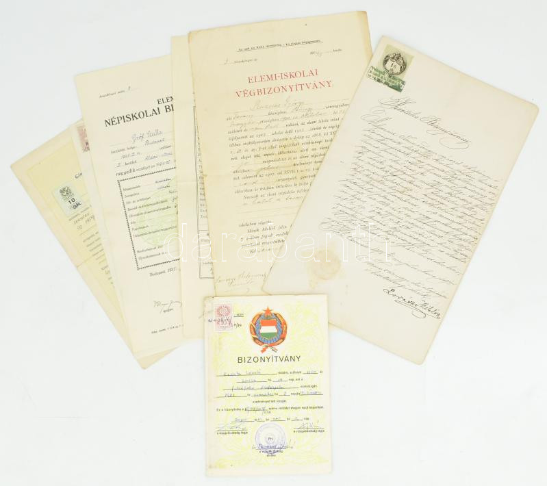 1871-1984 7 db különböző bizonyítvány (közte 1871-es, Lovászi Miklós, Torna vármegye első alispánja által kiállított és aláírt bizonyítvány, papírfelzetes viaszpecséttel, 1ft okmánybélyeggel). Vegyes méretben és állapotban.