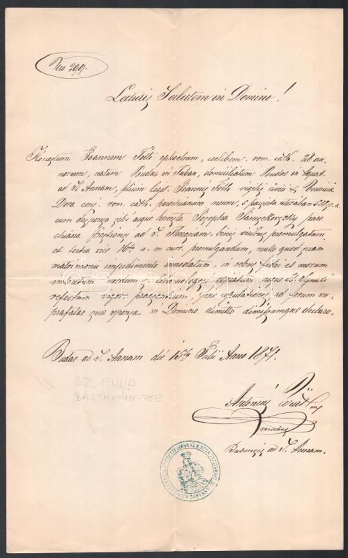 1871 Buda, Batthyány tér, Szent Anna-templom latin nyelvű okmánya https://www.darabanth.com/hu/451-Gyorsarveres/451.0/Mutargy-papirregiseg-egyeb/Okmanyok~500022/1871-Buda-Batthyany-ter-Szent-Anna-templom-latin-nyelvu-okmanya~II2999383