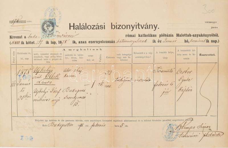 Leírás: 1878 Budapest, halálozási bizonyítvány 50 kr okmánybélyeggel