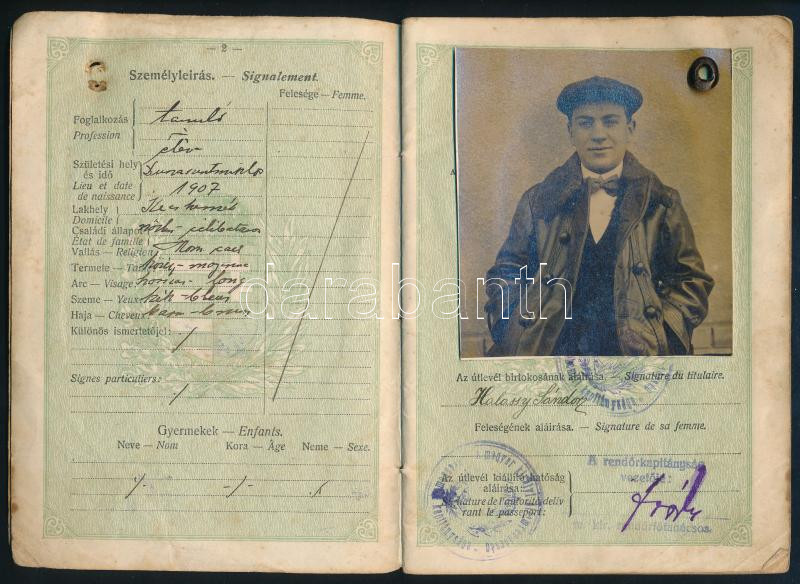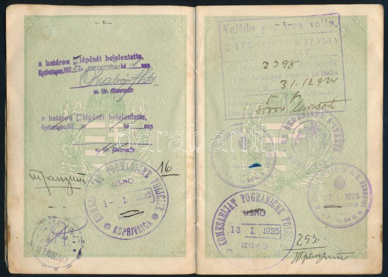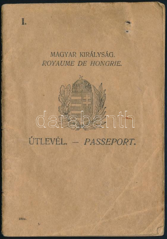 1925 A Magyar Királyság fényképes útlevele, benne bélyegzésekkel https://www.darabanth.com/hu/451-Gyorsarveres/451.0/Mutargy-papirregiseg-egyeb/Okmanyok~500022/1925-A-Magyar-Kiralysag-fenykepes-utlevele-benne-belyegzesekkel~II2987544
