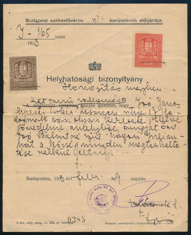 1933 Helyhatósági bizonyítvány 20+80f bélyegekkel, kézi érvényteleníté... https://www.darabanth.com/hu/451-Gyorsarveres/451.0/Mutargy-papirregiseg-egyeb/Okmanyok~500022/1933-Helyhatosagi-bizonyitvany-20plus80f-belyegekkel-kezi-ervenytelenitessel~II2998539