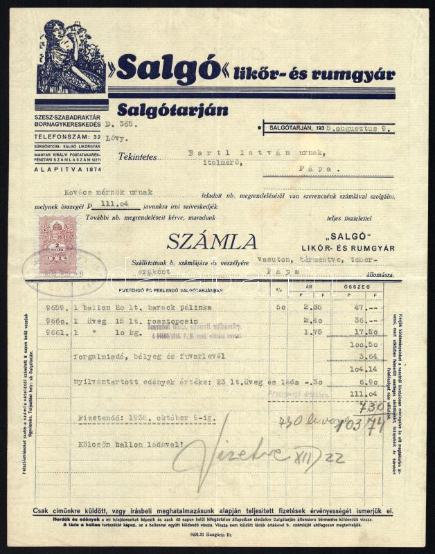 1935 Salgó likőr- és rumgyár, Salgótarján fejléces számla https://www.darabanth.com/hu/451-Gyorsarveres/451.0/Mutargy-papirregiseg-egyeb/Okmanyok~500022/1935-Salgo-likor-es-rumgyar-Salgotarjan-fejleces-szamla~II2988188