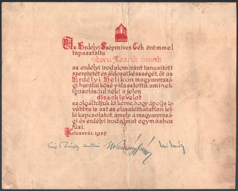 Leírás: 1937 Erdélyi Szépmíves Céh köszönő oklevele nyomtatott aláírásokkal