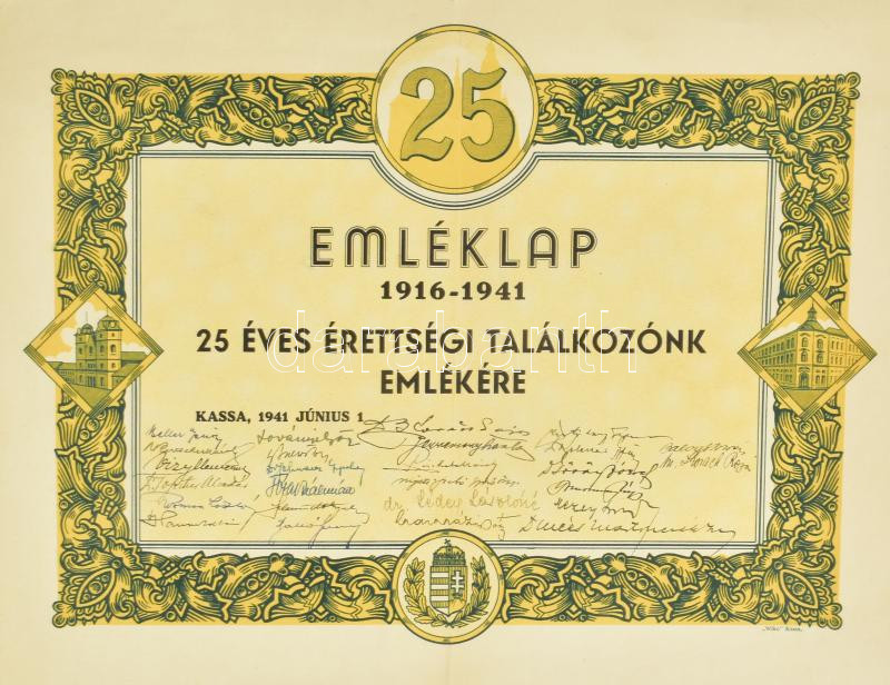 Leírás: 1941 Kassa, "Emléklap 25 éves érettségi találkozónk emlékére", 1916-1941, grafikus oklevél számos aláírással. Kassa, "Wiko"-ny., középen hajtott, 40,5x30,5 cm