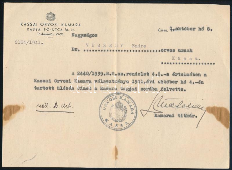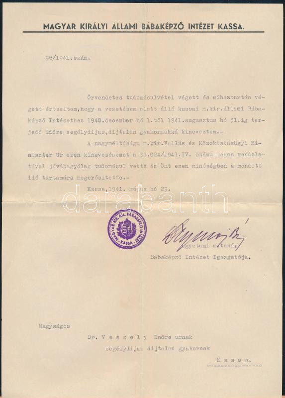 Leírás: 1941 Kassai Bábaképző Intézet hivatalos levele