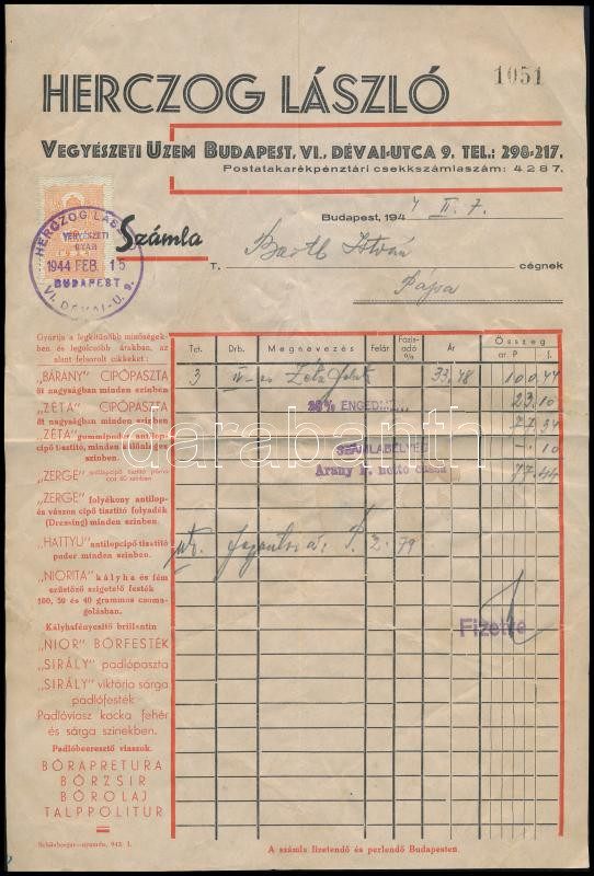 Leírás: 1944 Herczog László Vegyészeti Üzem, Bp., Dévai u. 9. - Cipőpaszta / Bőrfesték / Padlóbeeresztő fejléces számla
