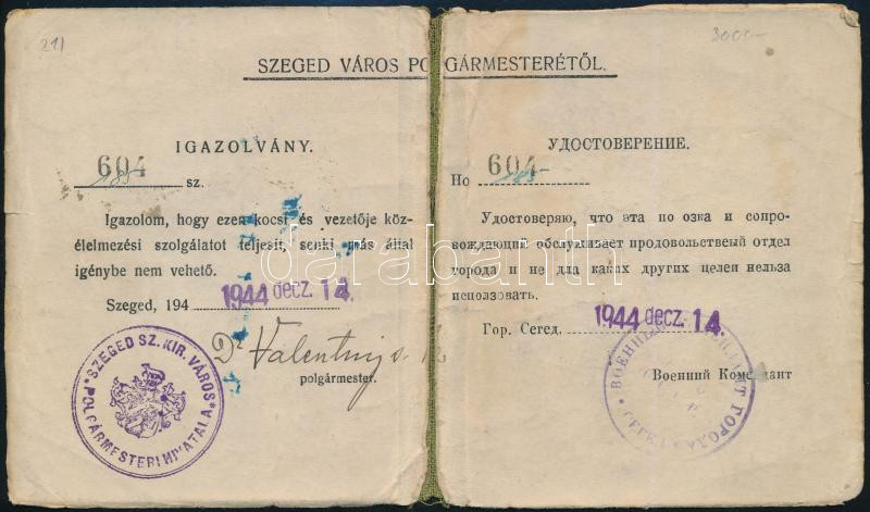 1944 Szeged orosz-magyar kétnyelvű igazolvány https://www.darabanth.com/hu/451-Gyorsarveres/451.0/Mutargy-papirregiseg-egyeb/Okmanyok~500022/1944-Szeged-orosz-magyar-ketnyelvu-igazolvany~II2964478