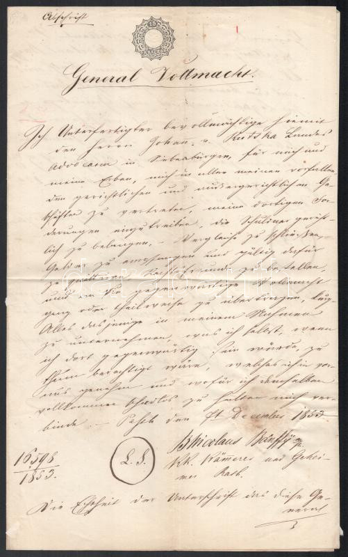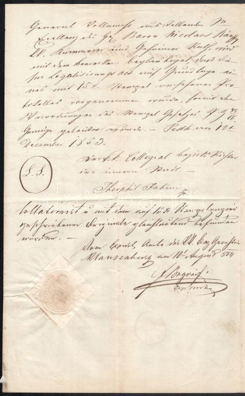 Pest 1853 Meghatalmazás 15kr szignettás papíron
