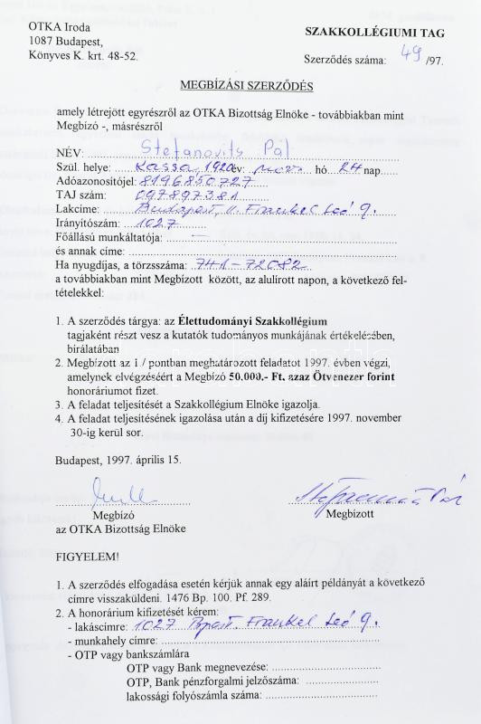 cca 1973-2002 Dr. Stefanovits Pál (1920-2016) vegyészmérnök, talajtanász, egyetemi tanár, az MTA tagjának iratai: kinevezések, fizetési besorolások, stb. Összesen kb. 50 db, mappában.