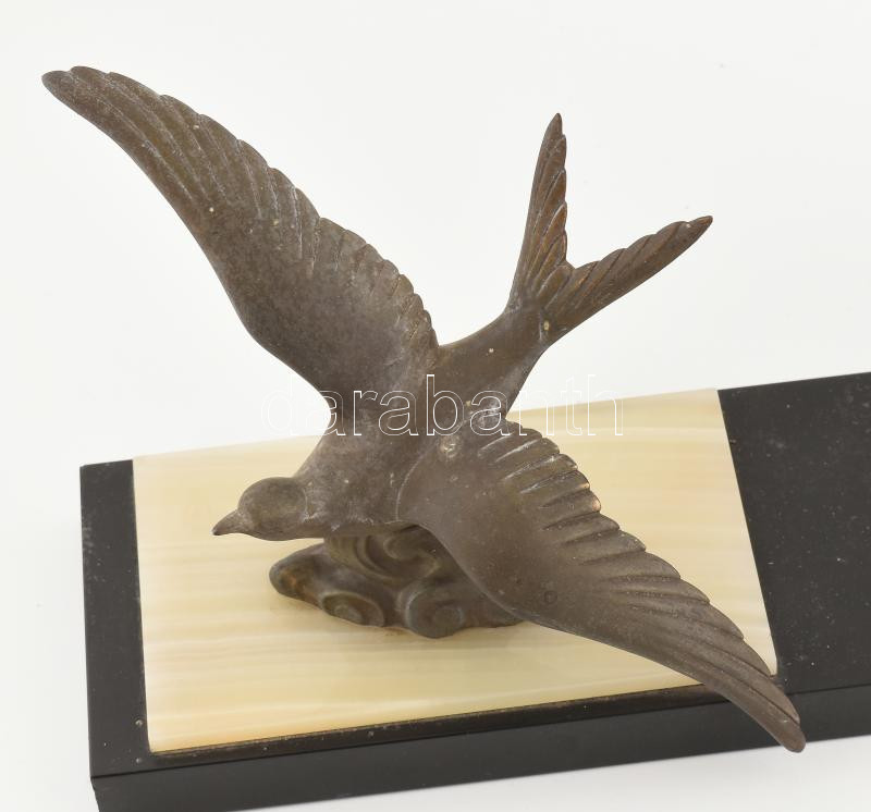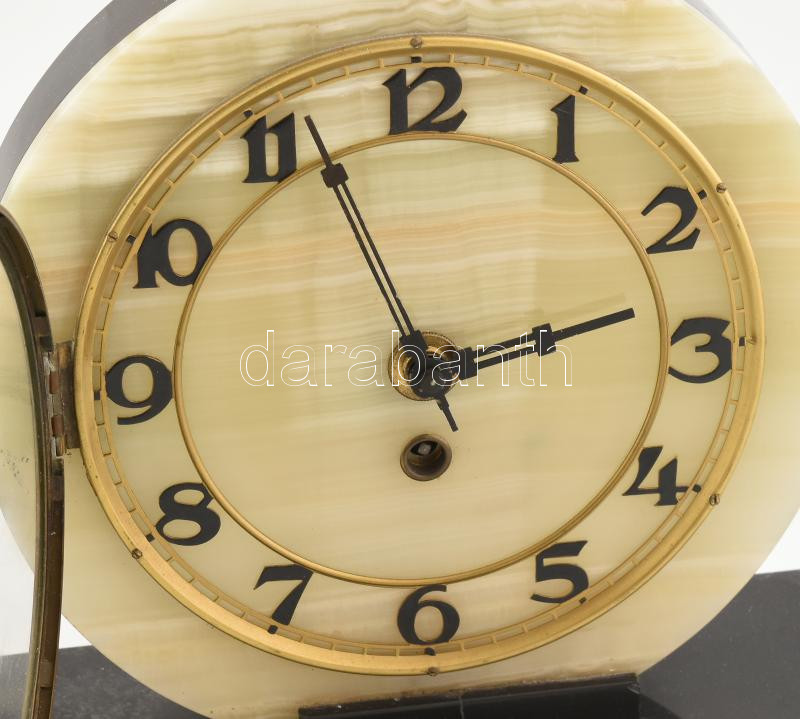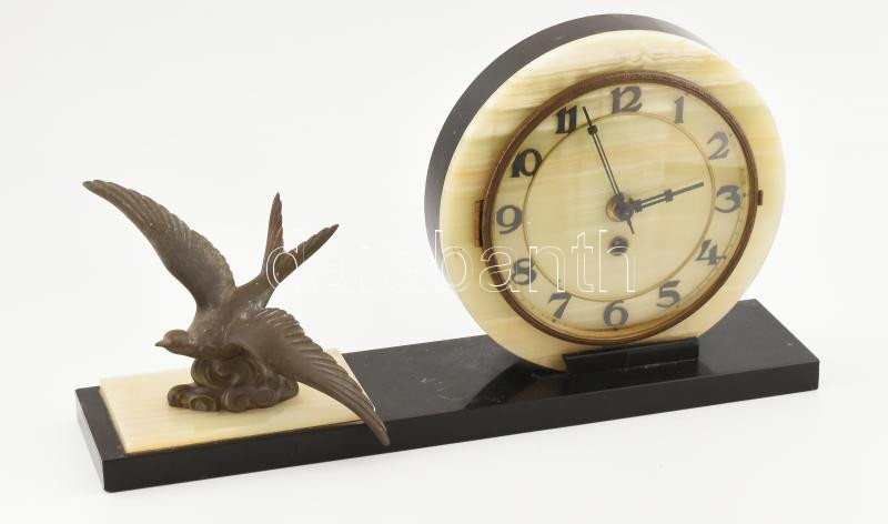 Leírás: Art Deco ónix, márvány, figurális, kandallóóra, mechanikus, nincs kipróbálva, 24x45 cm