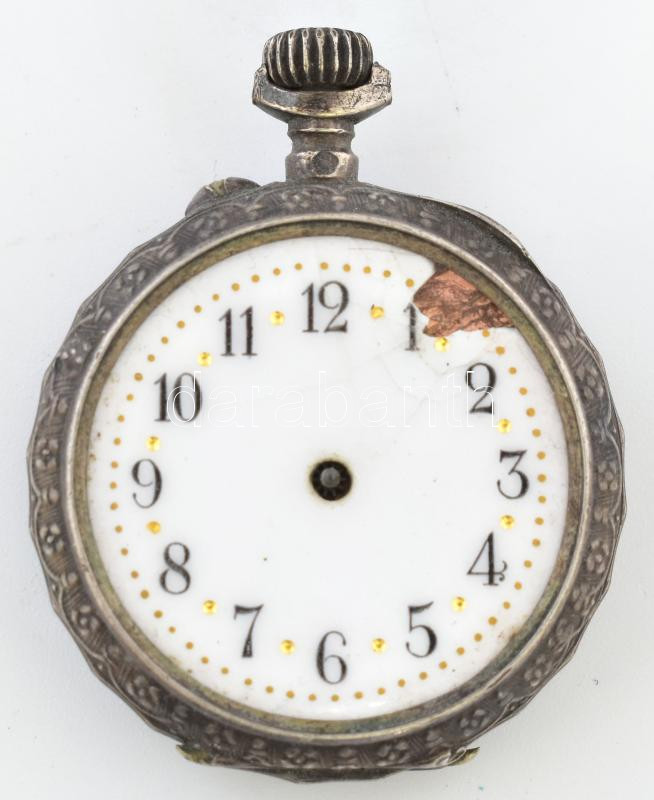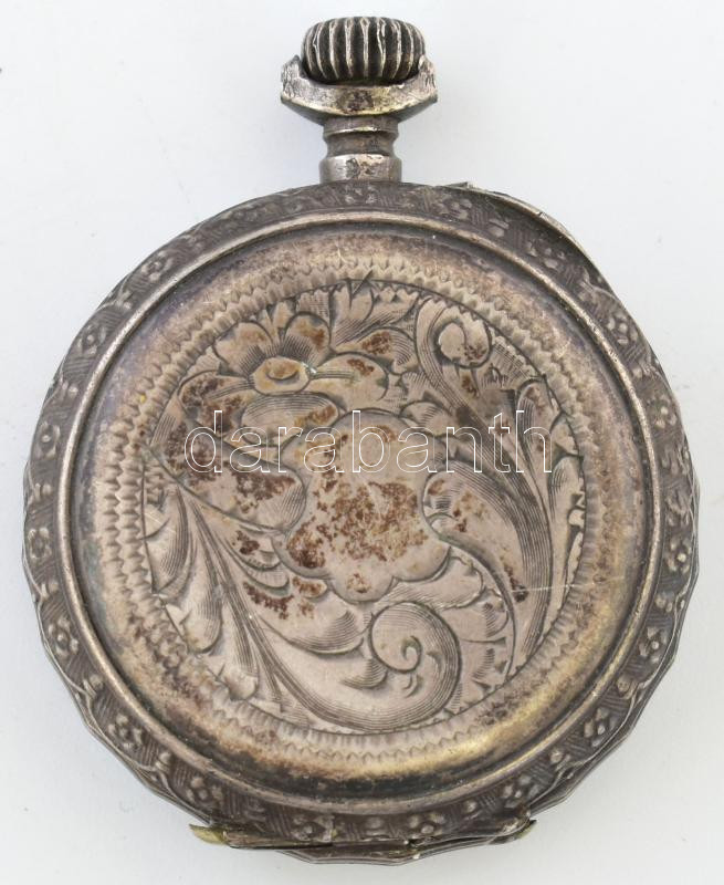 Leírás: Ezüst (Ag) tokos zsebóra, nem működik, jelzéssel, plexilapja hiányzik, sérüléssekkel, d: 25 mm