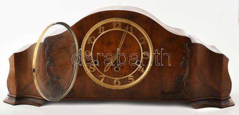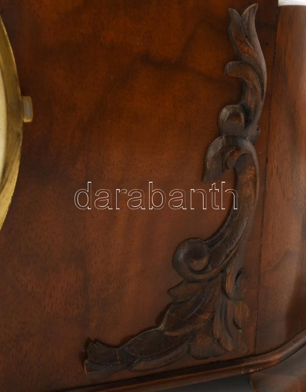 Leírás: Westminster dallamot is játszó felesütős, ingajáratos kandallóóra. Faragott fa, jelzés nélkül,működő, jó állapotban, szépen üt 57 cm