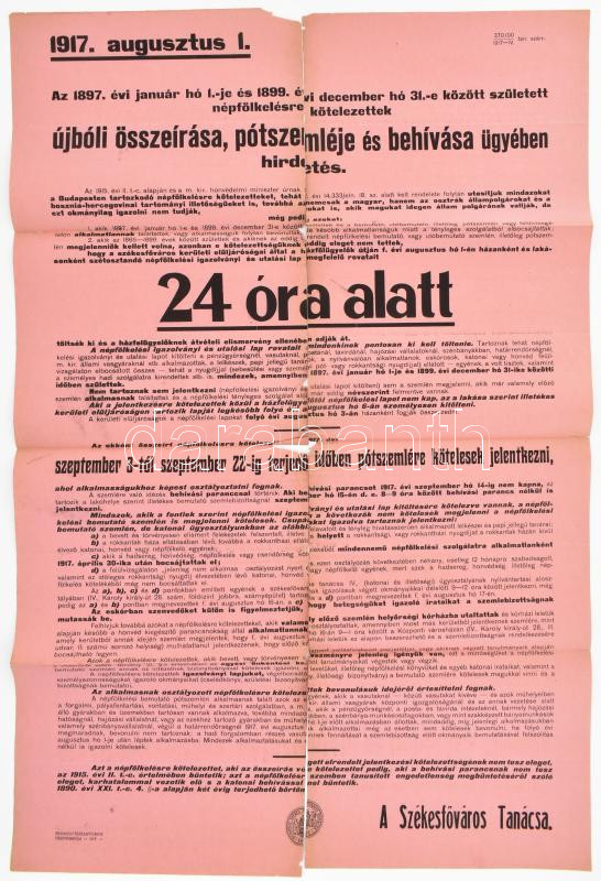 Leírás: 1917 Bp. Székesfőváros Tanácsának hirdetménye a népfölkelésre kötelezettek újbóli összeírása, pótszemléje és behívása ügyében. Két részben, sérülésekkel, (2 x) 95x31 cm