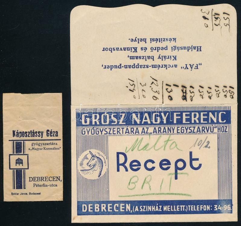 cca 1920-1940 Debrecen, Grósz Nagy Ferenc Gyógyszertára az "Arany Egyszervúhoz" receptboríték, a hátoldalán egykorú bejegyzésekkel, 8x11 cm + Debrecen, Káposztássy Géza gyógyszertára a "Magyar Koronához" receptboríték, 7x4 cm