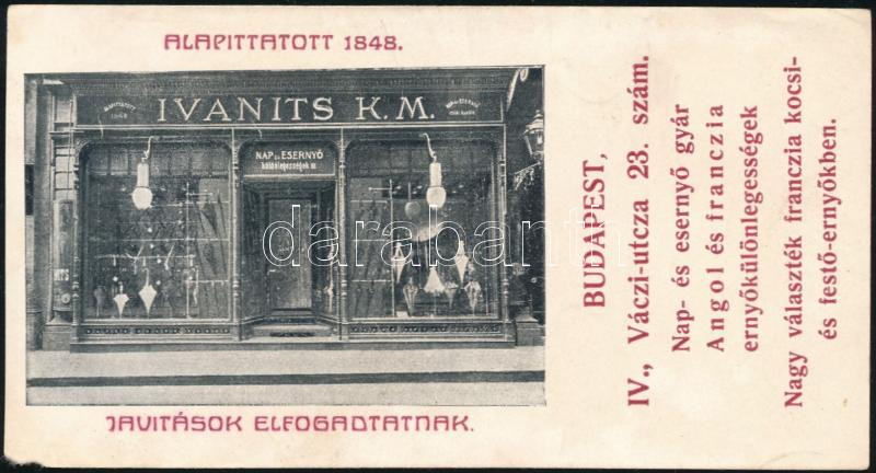 Leírás: cca 1920 Ivanits K. M. (Bp. IV., Váczi-u. 23.) nap- és esernyő különlegességek számolócédula