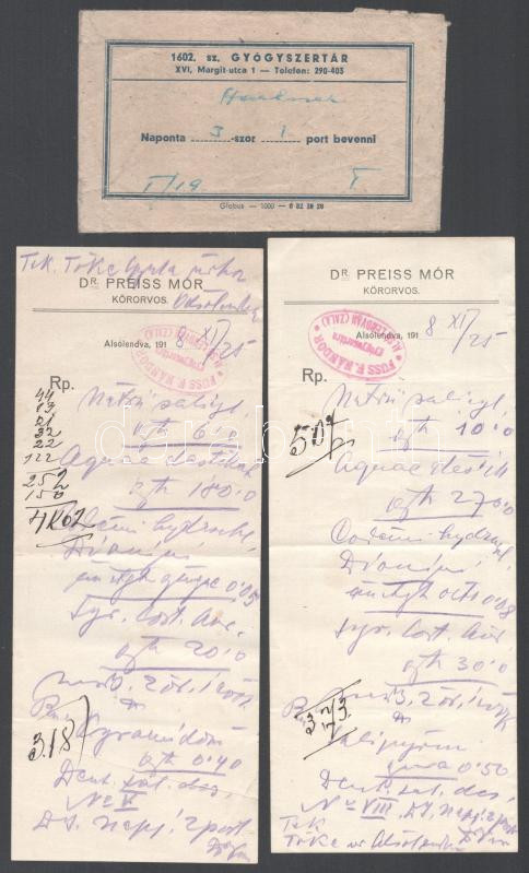 Leírás: cca 1930 Preiss Mór 2 recept + receptboríték XVI. Margit utca gyógyszertár