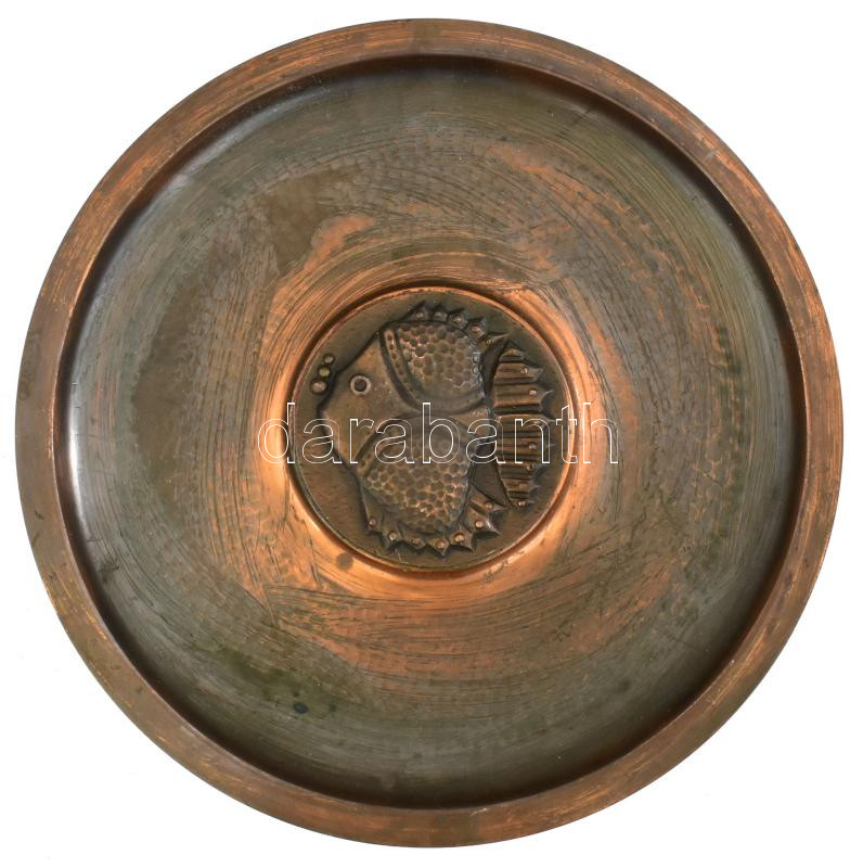 Leírás: Ismeretlen művész: Hal mintás iparművész falitál. Vastagabb anyagú bronzlemez, kopással, d: 31,5 cm