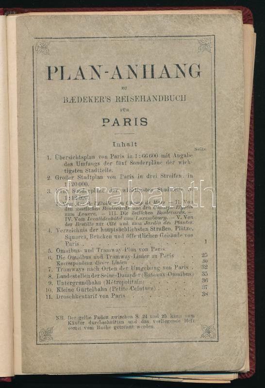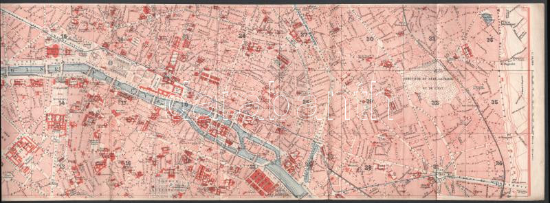 cca 1900-1910 Plan-Anhang zu Baedeker's Reisehandbuch für Paris. (Párizs utcajegyzék és térkép). 38 p. + 9 t. (kétoldalas ill. kihajtható, színes térképek). Német nyelven. Egészvászon-kötésben.