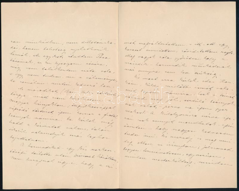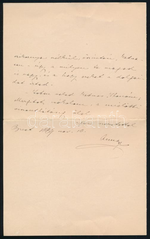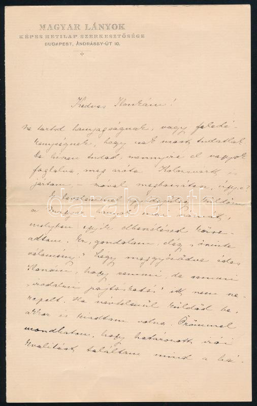 cca 1909 Tutsek Anna (1865-1944) író, a Magyar Lányok hetilap szerkesztőjének saját kezű levele, ,,Kedves Ilonkám!" megszólítással (Ginever Artúrné Győry Ilona (1868-1926) író részére), amelyben többek közt tájékoztatja, hogy a Magyar Lányok aznapi számában egyik elbeszélést közreadta, illetve egy másik (Bán Julis története című) elbeszélését nem közölheti, mivel a történet öngyilkossággal végződik. Négy beírt oldal, "Magyar Lányok képes hetilap szerkesztősége" fejléces levélpapíron.