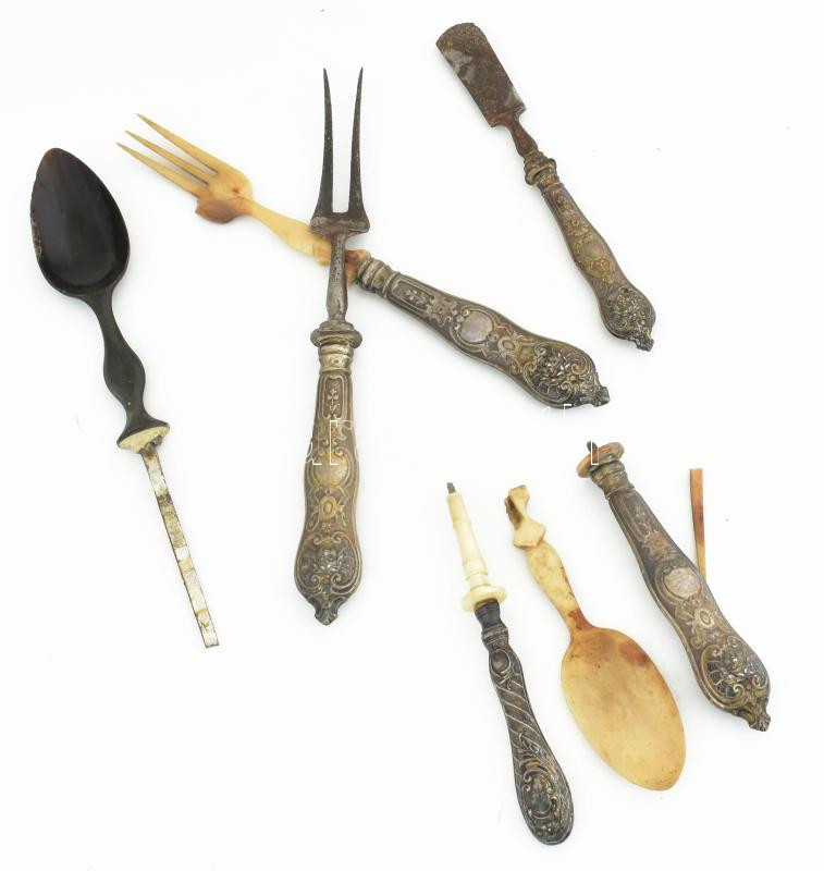 Leírás: 5 db ezüst (Ag) nyelű evőeszköz, sérülésekkel