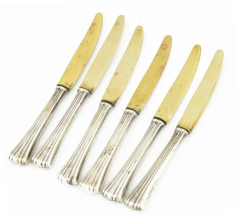 Leírás: 6 db ezüst (Ag) nyelű kés, jelzéssel, h: 17 cm